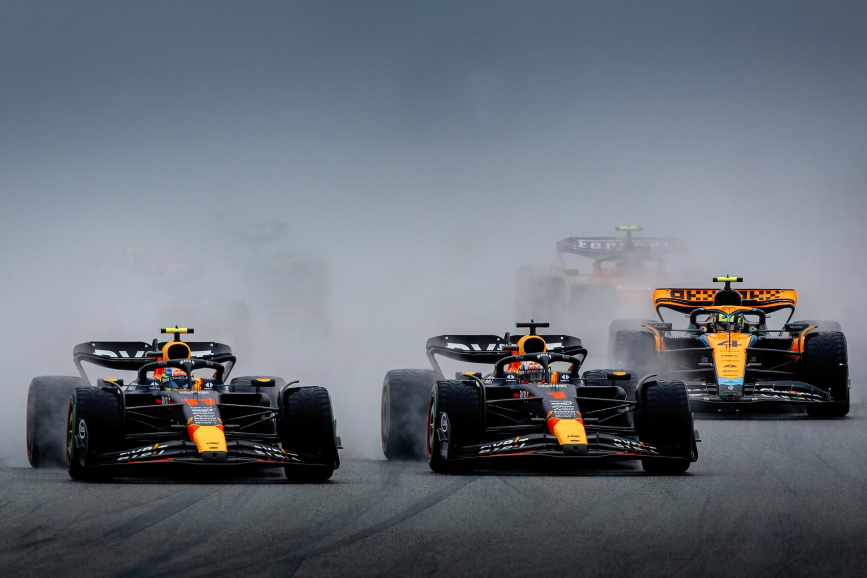 A rajtrácsra Verstappen, Pérez, Norris, Hülkenberg sorrendben állt fel az élmezőny, a startot pedig a mexikói kapta el jobban, ami látványos csatát eredményezett az első kanyarokban a két Red Bull között. A célegyenes végén Pérez a belső ívről átvette a vezetést, ám a második egyenes végén – dacára annak, hogy a kigyorsítás során pár pillanatra két kerékkel a fűre került – Verstappen be tudott vetődni csapattársa mellé. A kanyarban nehezen állította meg az autóját a holland, így bár a vezetést visszavette, de leszorította a pályáról Pérezt, na meg komolyabb torlódást okozott mögöttük, ami Norrisnak sok pozíciójába került.